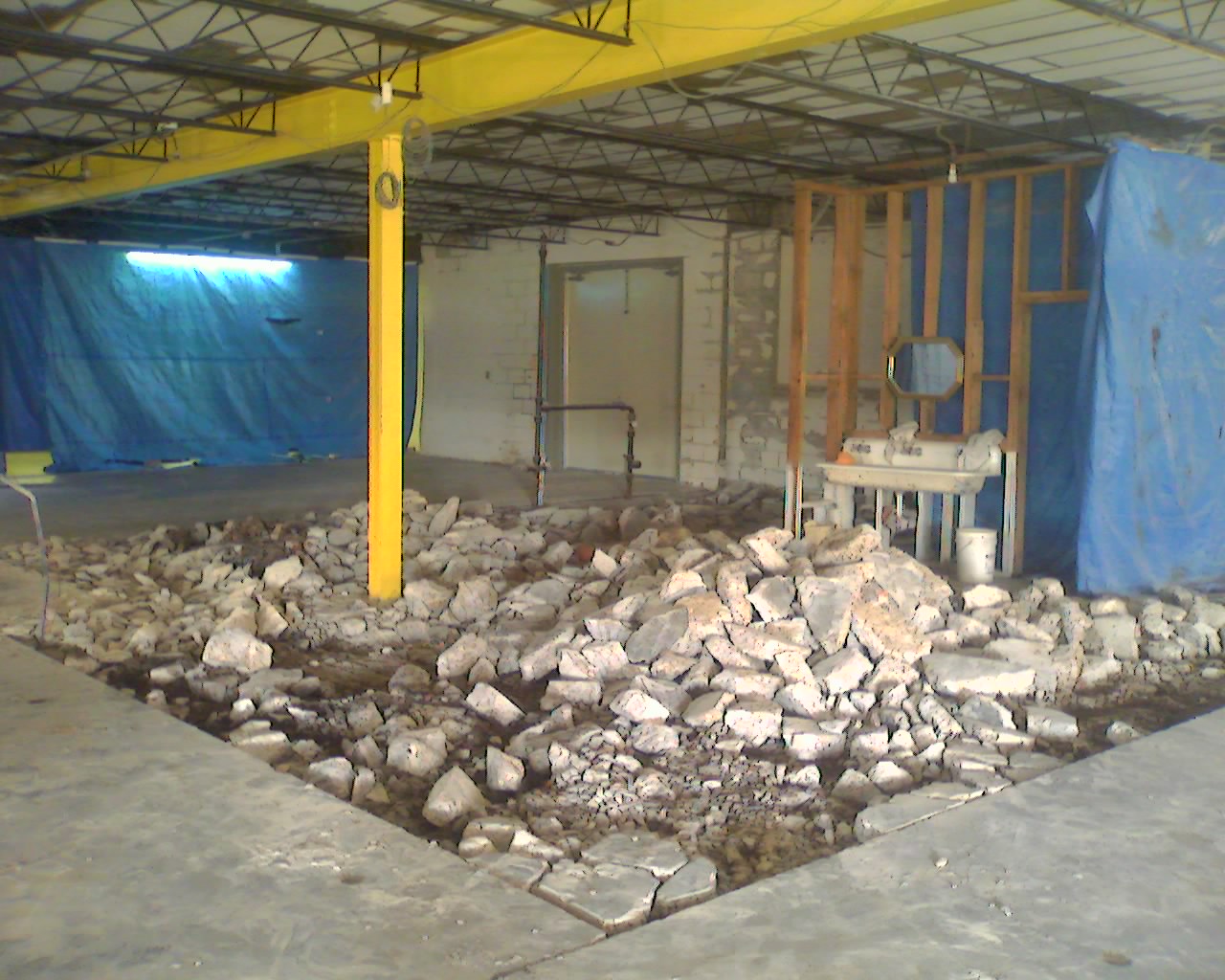 To create a level playing field, Foundation Specialists mudjack 9,000 s.f. of concrete and jack hammer another 1,000 s.f. for good measure. With mudjacking, a limestone and cement slurry is pumped under pressure through holes drilled into the concrete floor slabs in order to create hydraulic pressure, raising and leveling the slabs. Part art, part science, it worked!