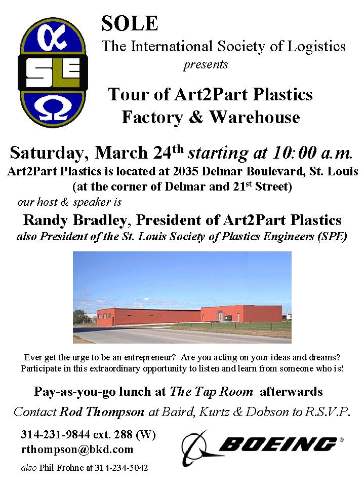 The St. Louis Section of The International Society of Logistics (SOLE) sponsored a plant tour of the Art2Part® facilities on Saturday, March 24th, 2001. The tour offered an insight into the behind the scenes logistics of running a plastic injection molding plant and of renovating a light industrial building.